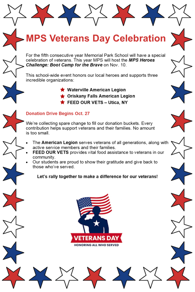 Memorial Park School’s donation drive for veterans and their families is underway. Bring your spare change and help honor our heroes—because every coin makes a difference.